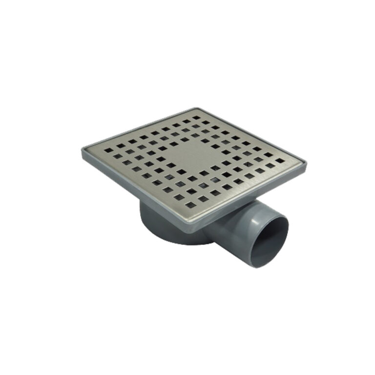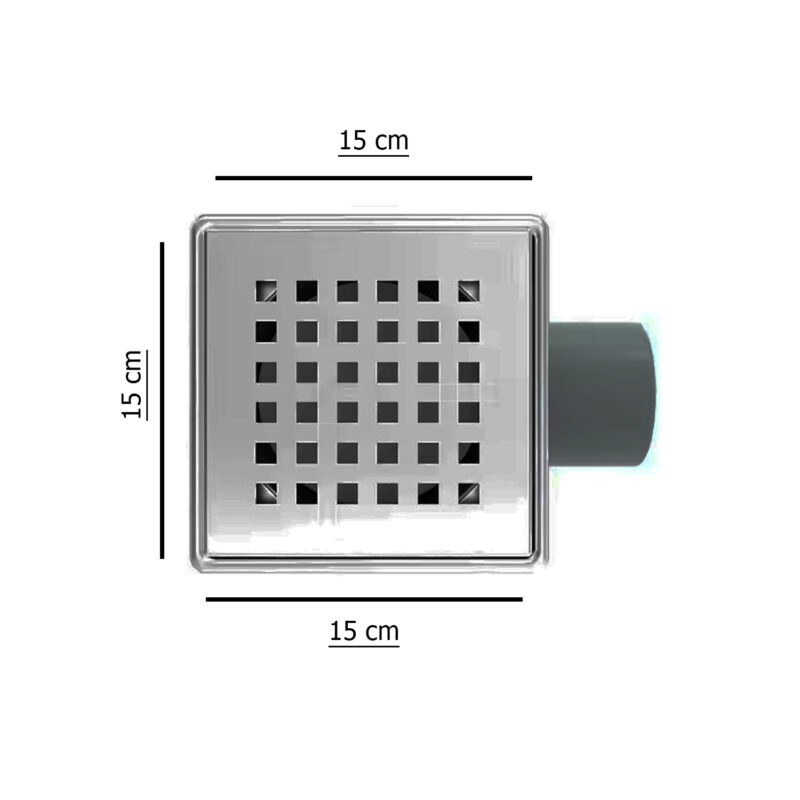 15×15 cm Paslanmaz Çelik Kare Yer Süzgeci – Klasik Desenli, Yan Çıkışlı Plastik Gövde